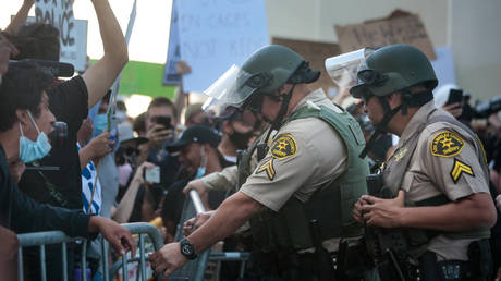 Black Lives Matter protesters have taken to the streets of LA for the fourth consecutive night, but footage of a mother holding her infant has sparked Twitter allegations of human shields and terrorist tactics being used. | The crowd of at least 100 protesters gathered near the South LA sheriff's deputy station for the fourth straight night of demonstrations, with police declaring an unlawful assembly shortly thereafter, amid a torrent of vile verbal abuse from several protesters. | LA protester to police: "Use a f*cking donut as a flesh light"