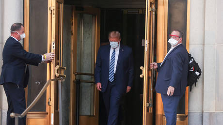 (2020-10-06). 'Don't let Covid-19 dominate you': Trump tells Americans to 'get out' & 'be careful' in first statement after hospital stay. rt.com US President Donald Trump has urged Americans not to fear the coronavirus and pledged that he would soon be "back to work" in his first statement from the White House since leaving hospital, where he was treated for Covid-19. | The president shared a brief video message on Twitter after returning to the White House on Monday evening, thanking staff at Walter Reed Medical Center and stating that he felt "better than I have in a long time" after his three-day stay. | "One thing that's for certain: Don't let [Covid-19] dominate you, don't be afraid of it, you're going to beat it. We have the best medical equipmen…